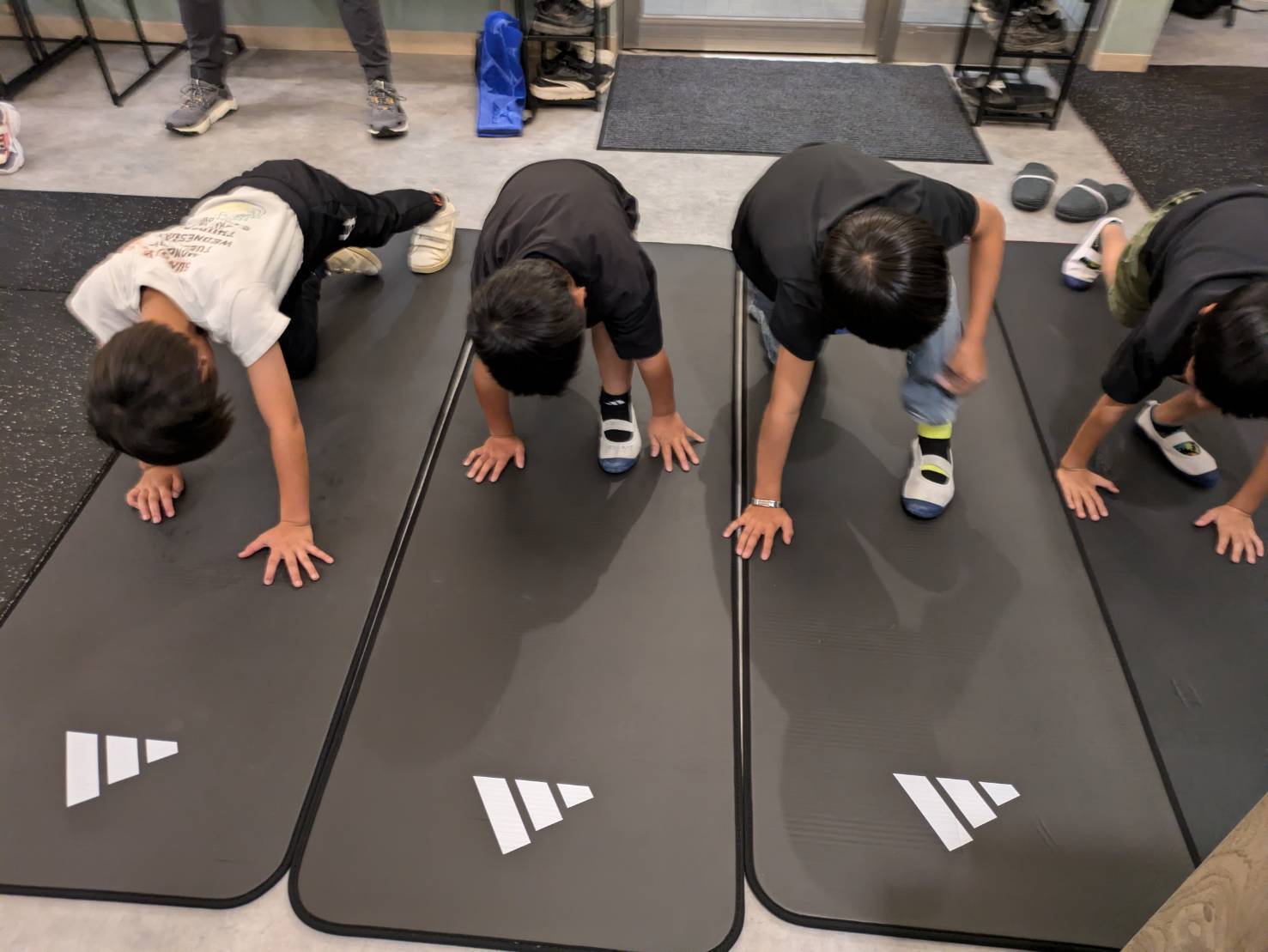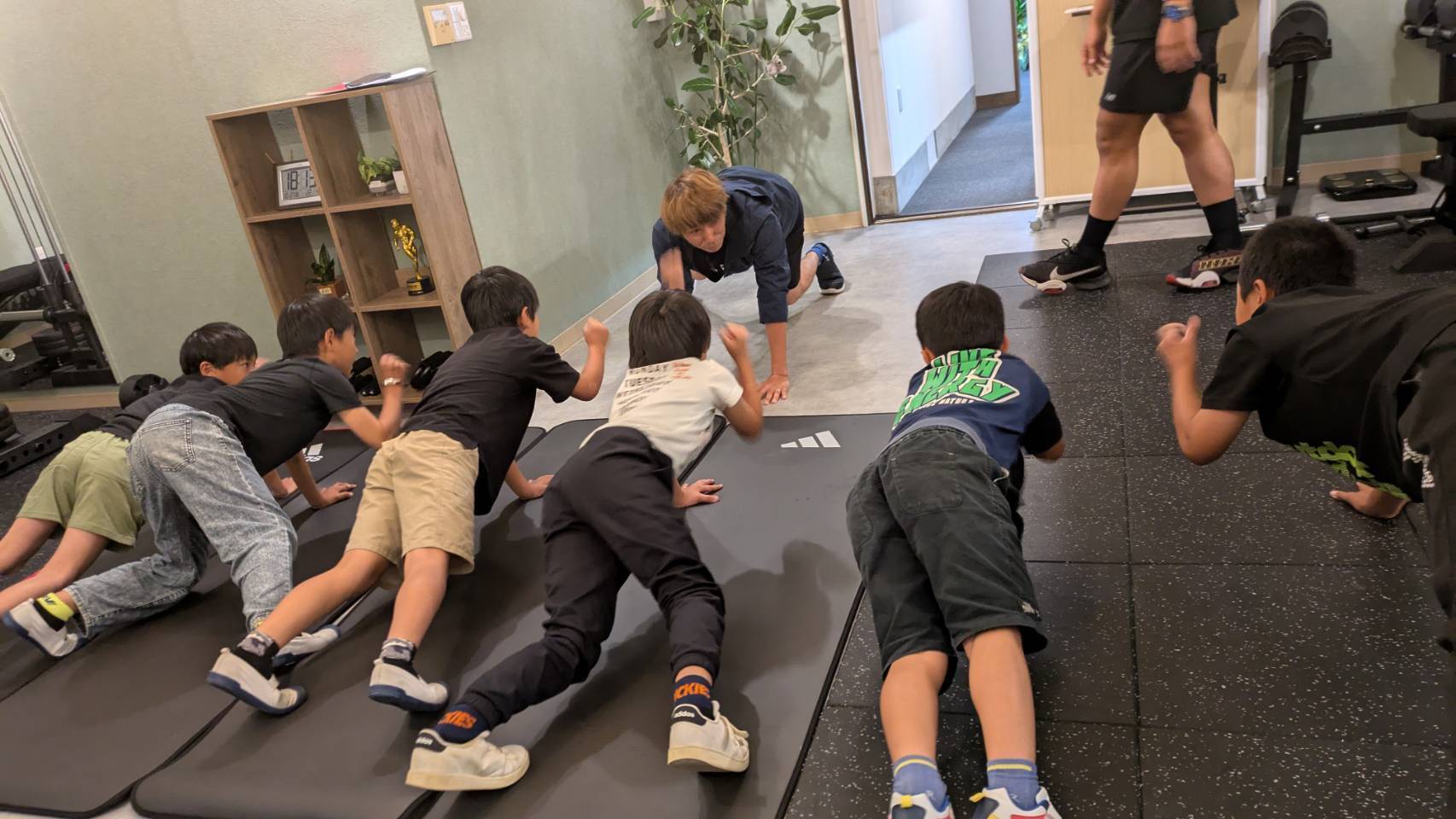その後、低学年は楽しく体幹を鍛えることを目的として「四つん這い(プランク)じゃんけん」で江口トレーナーと対決し、一生懸命バランスを取りながら笑顔で皆さん楽しそうに取り組まれていました。